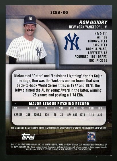 2025 Stadium Club Ron Guidry Certified Autographs #SCBA-RG - You don't see a lot of Guidry autographs on the market, but here is an attractive on-card signature from 2025 Stadium Club. A Cy Yong winner!