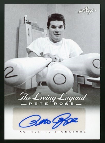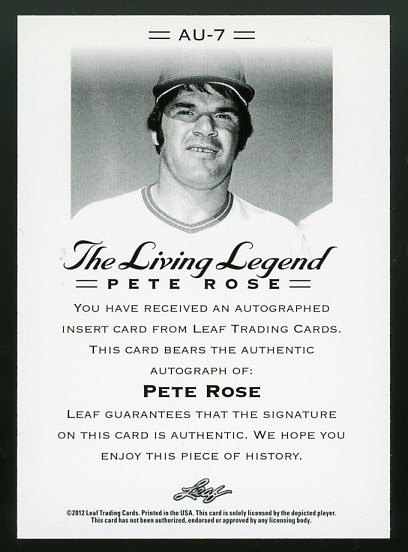 2012 Leaf Pete Rose Living Legend Autograph #AU-7 - Rose does not have many certified autographs that come from card manufacturers.  This Leaf issue was released in 2012 and still has a bold Rose signature.