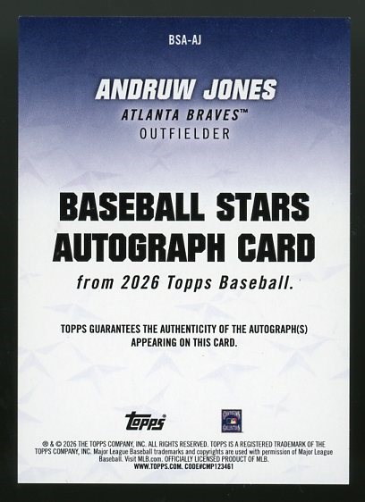 2026 Topps Andruw Jones Certified Autographs #BSA-AJ - This card is from the new 2026 Topps product and features a nice autograph of Andruw Jones. NM/MT.