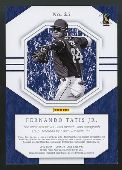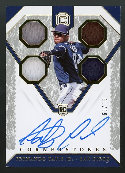 2019 Panini Cornerstones Fernando Tatis, Jr. Quad Game Jersey Autograph RC  #25 (#'d/99) - This rookie card features four relics and an on-card autograph of Frenando Tatis, Jr.  Limited to 99 made and is NM or better.