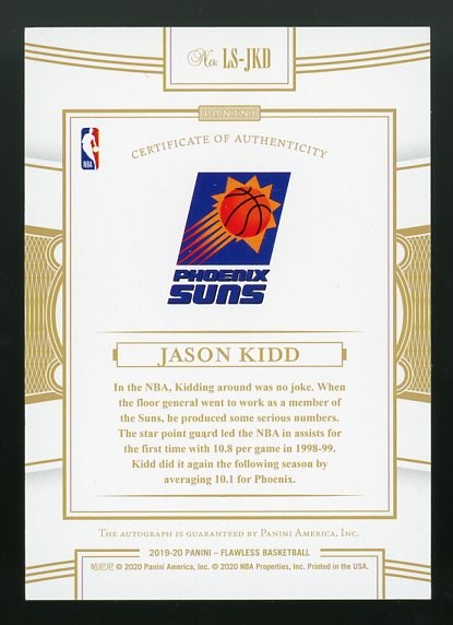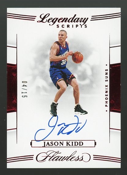 2019 Panini Flawless Scripts Jason Kidd Autograph Ruby #'d/15 - Here is a great offering from Panini's premium brand Flawless, featuring an on card autograph of HOFer Jason Kidd. Serial numbered out of just 15 made, this is a must have card for the basketball collector. NM/MT