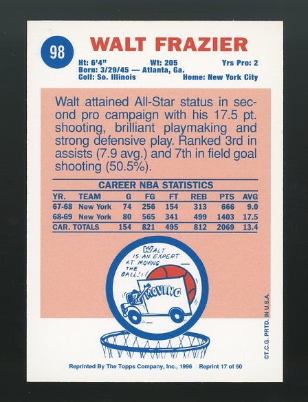 1996 Topps NBA Stars Walt Frazier Rookie Reprints Certified Autograph #17 - A nice on-card signature of Hall of Famer Walt Frazier. Card is NM/MT.