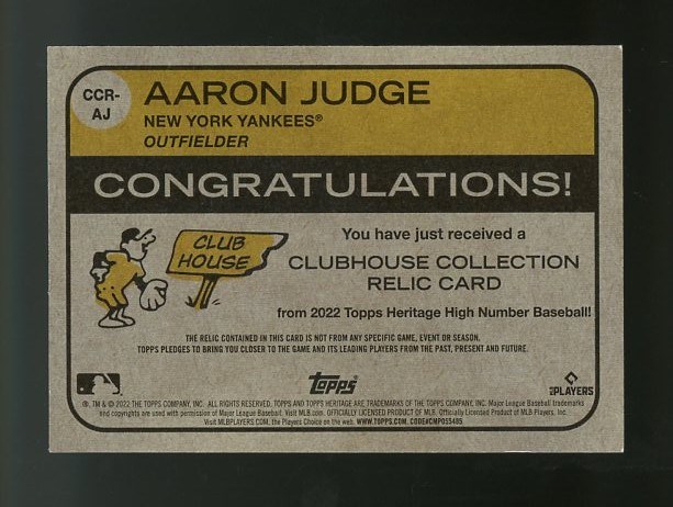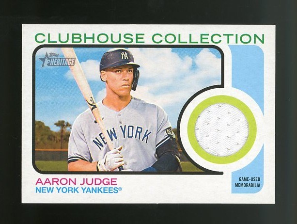 2022 Topps Heritage Aaron Judge Clubhouse Collection Game Jersey Relic #CCR-AJ - Up for auction is a piece of game used jersey from Aaron Judge offered in the 2022 Topps Heritage product. NM/MT.