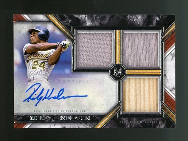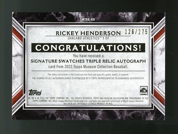 2022 Topps Museum Collection Rickey Henderson Triple Relic Autograph #RH (#'d/275) - This is a high quality card that deserves your attention. Henderson autographs have been on the rise, and this is a high end card. Three relics plus a great signature. Card is in great shape, NM/MT or better.