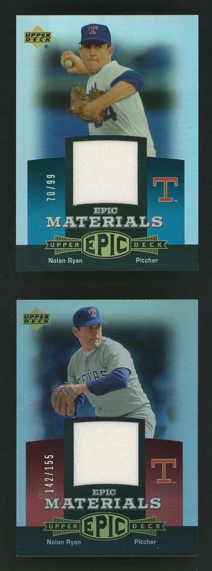 Lot of 2 2006 Upper Deck Nolan Ryan Epic Materials Red (#'d/155) and Teal Blue (#'d/99) - Here is a great Ryan lot, with both of these game used relic cards having very low production.  Both are NM or better.