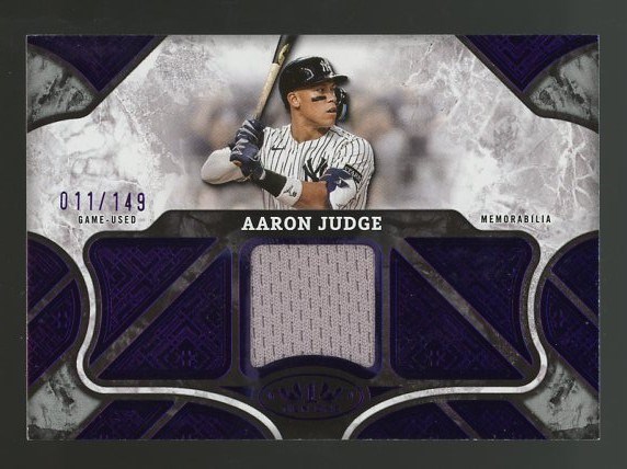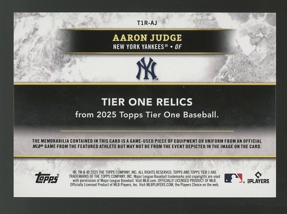 2025 Topps Tier One Aaron Judge Game Used Memorabilia #T1R-AJ (#'d/149) - This card features a gray swatch from a game used jersey of Aaron Judge. Card is NM/MT and limited to #149 made.