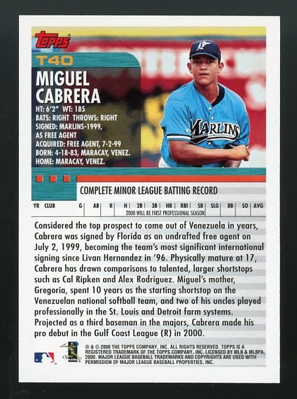 2000 Topps Traded Miguel Cabrera RC #T40 - Here is an ungraded Cabrera from the 2000 Topps Traded set.  Card is NM.