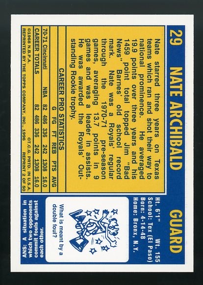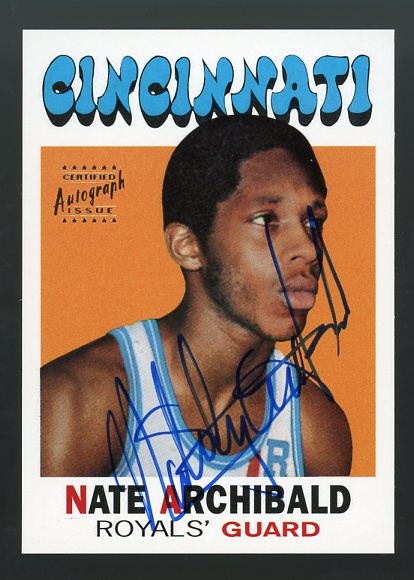 1996 Topps NBA Stars Nate Archibald Rookie Reprint Autographs #2 - Signed in blue ink by Archibald from the 1996 Topps Certified Autographed Rookie Reprint product. Card is NM/MT.