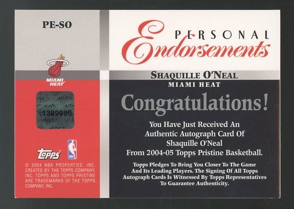 2004 Topps Pristine Shaquille O'Neal Personal Endorsements Autograph #PE-SO - Topps Pristine was a premium brand in 2004 and this Shaquille autograph has been in high demand ever since hitting the market. Card is NM or better.