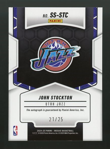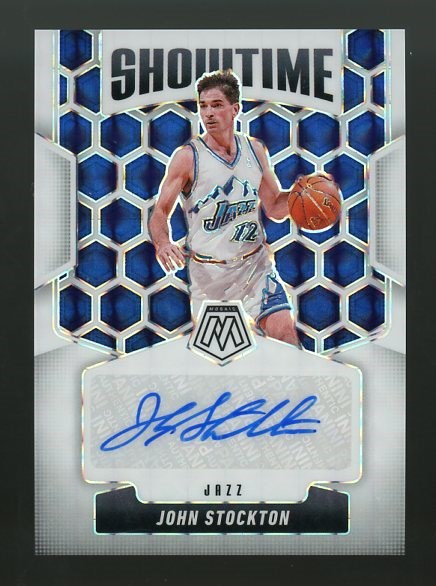 2024 Panini Mosaic John Stockton Showtime Signatures White Prizm #SS-STC (#'d/25) - This Showtime Signatures of Stockton is the rare White Prizm parallel numbered to 25. Mint.