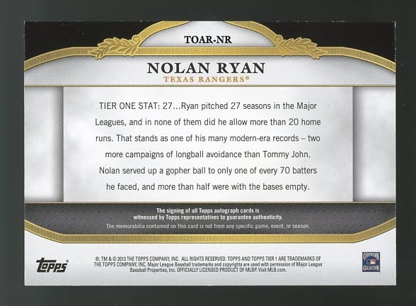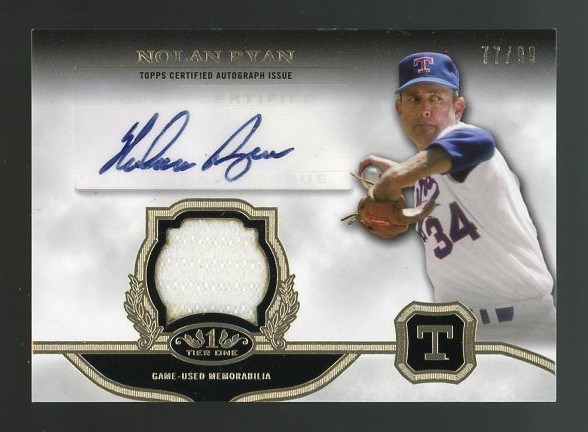 2013 Topps Tier One Nolan Ryan Relic Autograph #TOAR-NR (#'d/99) - A great looking game used jersey relic autograph of Nolan Ryan.  Serial numbered out of 99 made and in NM/MT condition.