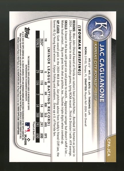 2025 Bowman Chrome Prospects Jac Caglianone Autograph RC #CPA-JCA - This is one of Caglianone's better autographed issues. Signed on-card and in mint condition. A great item!