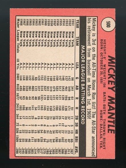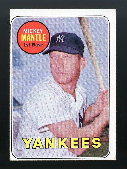 1969 Topps Mickey Mantle #500 (Yellow Letter) - This would be Mantle's last regular issue Topps card, featuring his complete career stats on the back.  Card is off center, no creases, with corner wear.  Overall grade VG