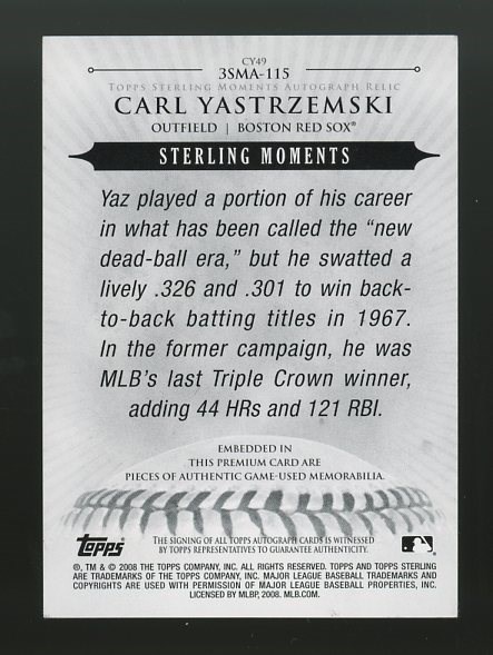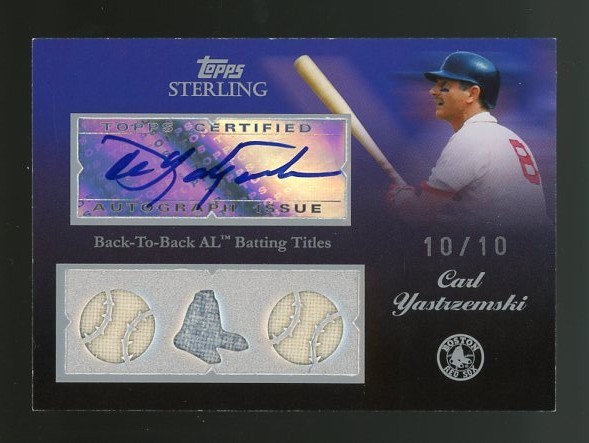 2008 Topps Sterling Carl Yastrzemski Triple Relic Autograph #'d/10 - From the popular Topps Sterling product, here is a beautiful Yastrzemski triple relic autograph serial numbered out of ten produced.