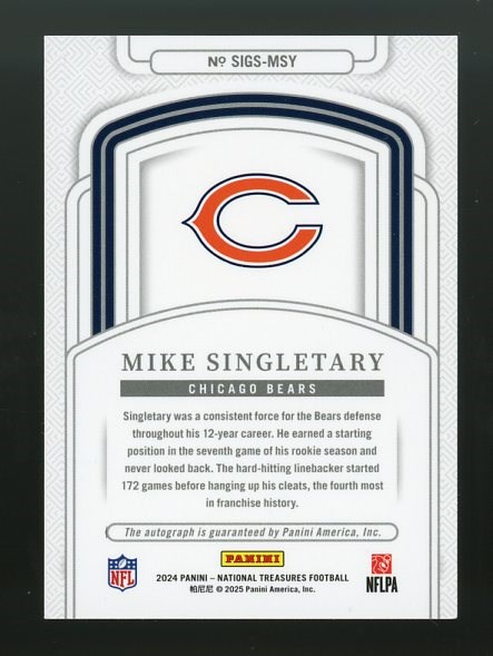 2024 National Treasures Mike Singletary Certified Autograph #SIGS-MSY #'d/99 - Singletary was elected to the Hall of Fame in 1998 and went to the Pro-Bowl ten times in his career.  Card is NM/MT or better.