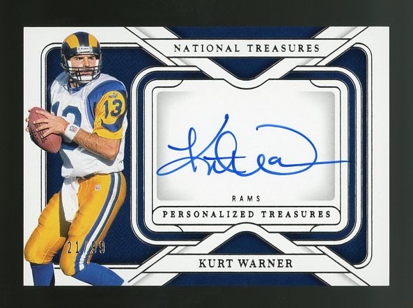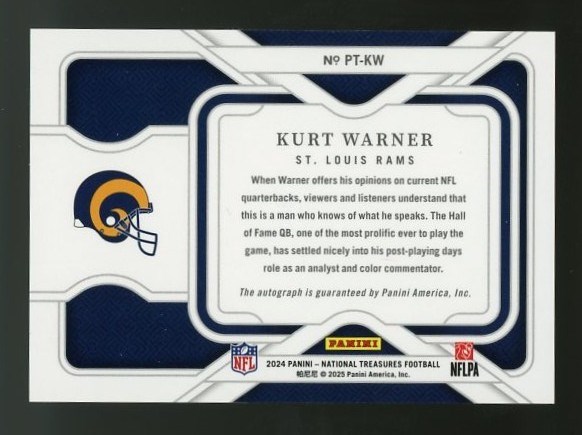 2024 National Treasures Kurt Warner Personalized Treasures Autograph #PT-KW (#'d/99) - A highly attractive card with a great on-card signature by Warner.  Card is NM/MT and ready for you to display in your collection.