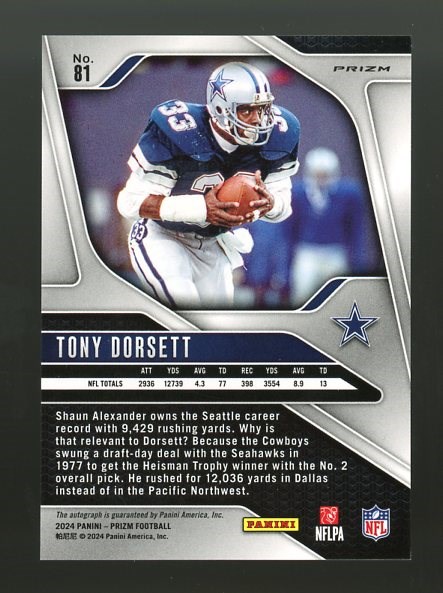 2024 Panini Prizm Tony Dorsett Autograph Silver Prizm #81 -Dorsett is both a College and Pro Football Hall of Famer as well as a Heisman Trophy recipient. This 2024 Silver Prizm autograph is in great shape, NM/MT or better.