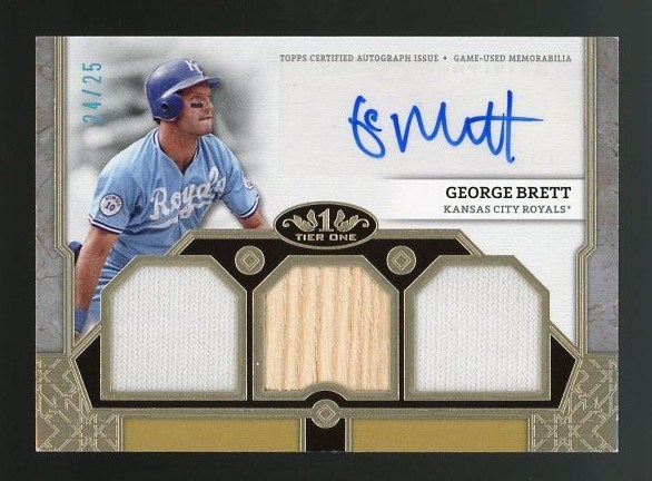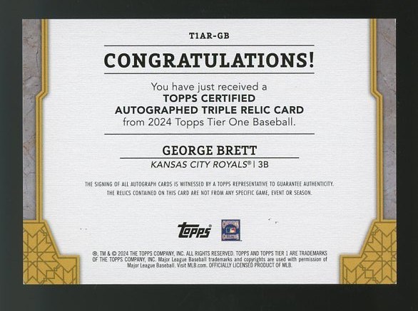 2024 Topps Teir One George Brett Triple Relic Autograph #T1AR-GB #'d/25 - A great item, this 2024 Topps issue features three game used relics of Brett, with a solid NM/MT signature. Only 25 produced and this one is NM/MT.