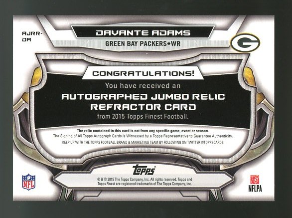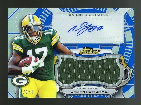 2015 Finest Davante Adams Game Used Jersey Autograph #'d/150 - Card features a jumbo sized game used swatch to go along with a great Adams signature. A very nice item and in NM/MT condition.