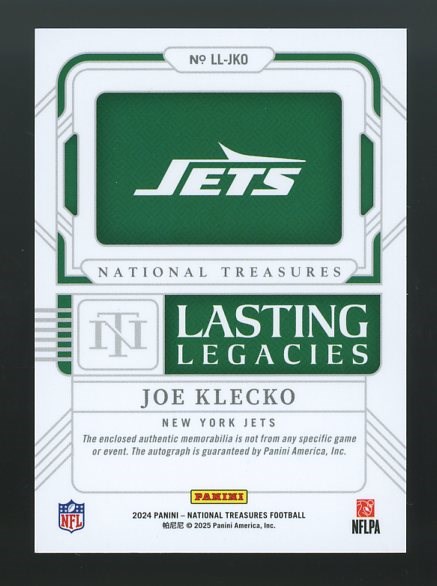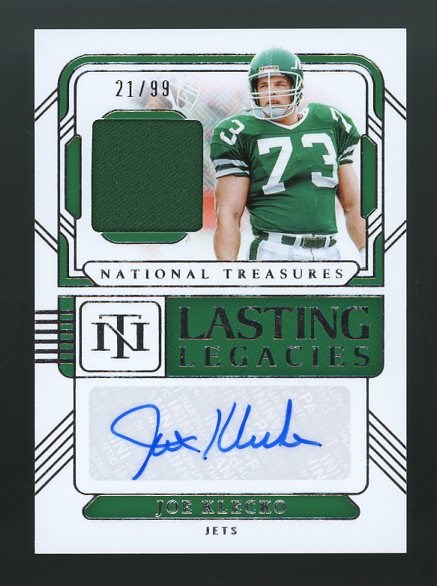 2024 National Treasures Joe Klecko Lasting Legacies Patch Autograph #'d/99 - A green game used patch relic accompanies this Klecko signature.  Card and auto are NM/MT.