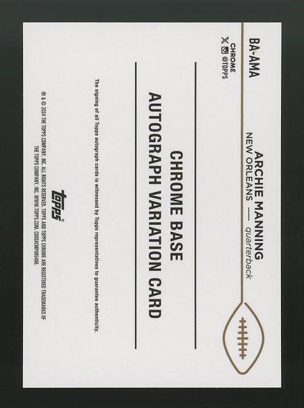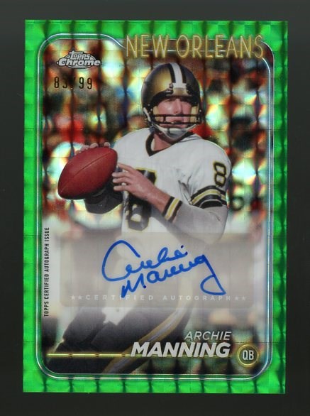 2024 Topps Chrome Archie Manning Green Geometric Refractor Autograph #'d/99 - The patriarch of the Manning football dynasty, Archie is the father of quarterbacks Peyton and Eli Manning.