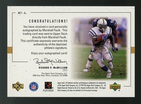 1999 SP Authentic Marshall Faulk Player's Ink Autograph #MF-A - An attractive card design with on-card signatures, made the 1999 SP Player's Ink subset popular. Here is Marshall Faulk in NM/MT condition.