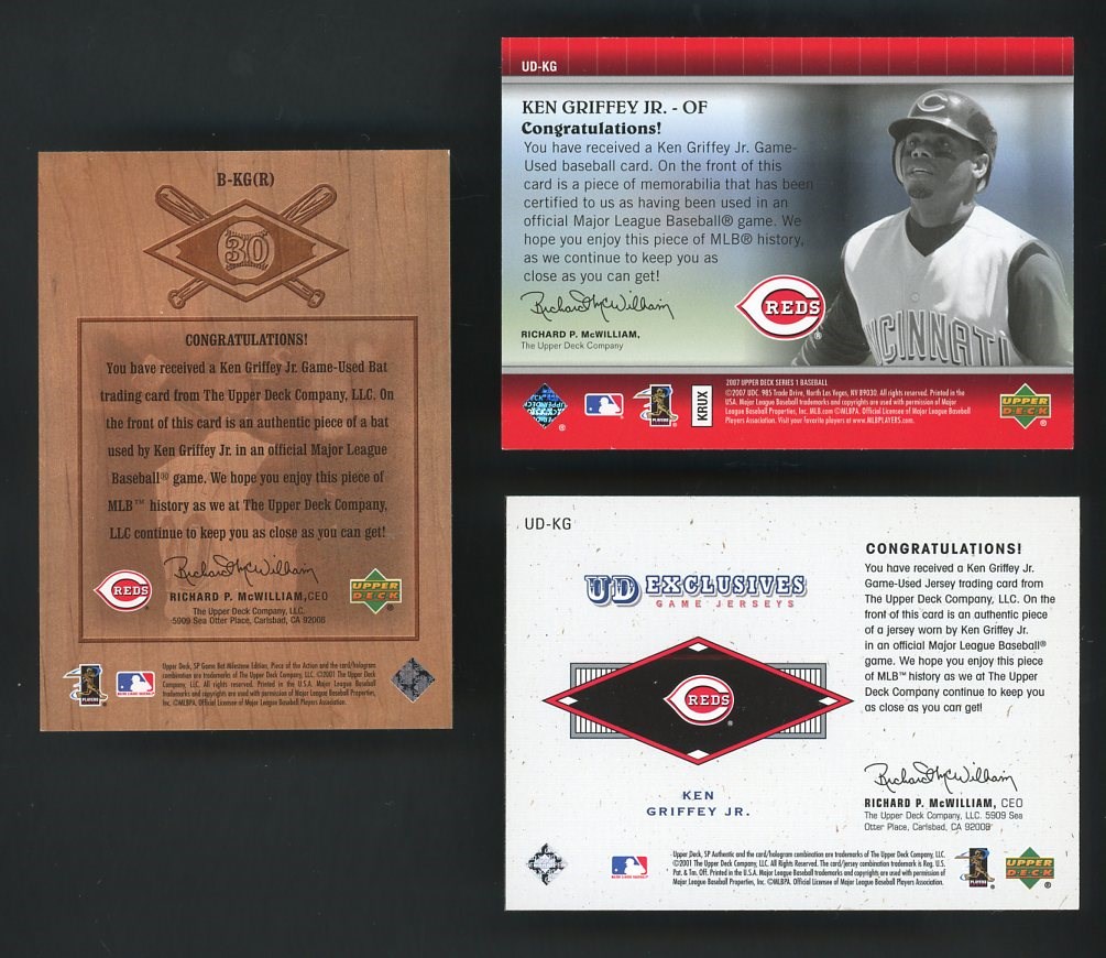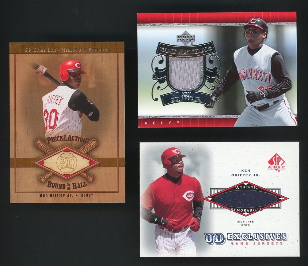 Lot of 3 Different Ken Griffey, Jr. Game Used Relic Cards - Includes his 2001 SP?Game Bat Milestones Bat Relic, 2001 SP?Authentic Game Jerseys, and 2007 Upper Deck Game Jerseys. All three are NM or better