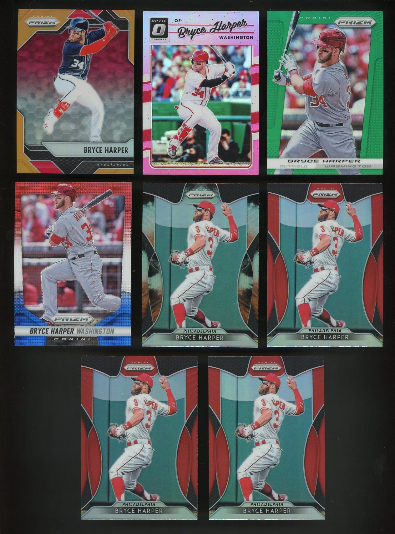 Lot of 8 Bryce Harper Prizm Parallels (2013-2019) - A great variety of very attractive Prizm parallels.  Cards are NM to NM/MT.