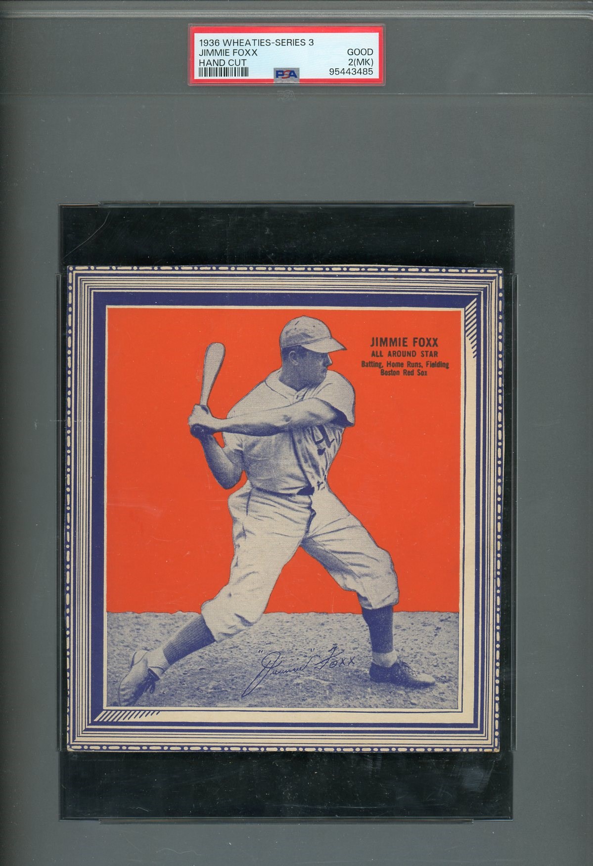 1936 Wheaties Jimmy Foxx Series 3 PSA Good 2MK - A super rare item! This Wheaties issue of Foxx has a total PSA population of four, with only one being graded higher than this one. Card has a light pencil mark on back.