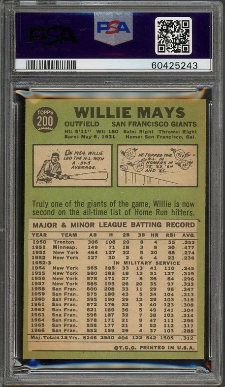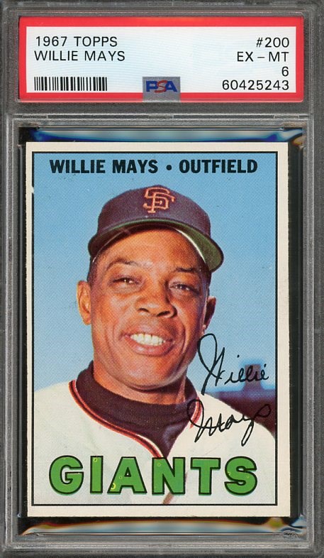 1967 Topps Willie Mays #200  PSA EX/MT 6 - This 1967 Mays is a solid PSA 6 with several near mint qualities.  Strong corners and original color highlight this PSA EX/MT 6 card.