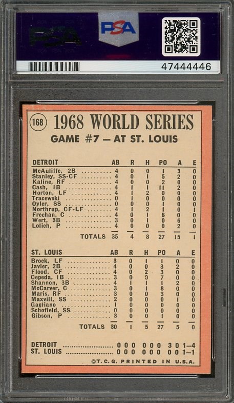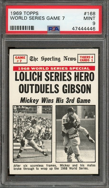 1969 Topps W.S. Game 7 Lolich Series Hero #168 PSA MINT 9 - Lolich upset Gibson in the World Series finale to secure the Tigers championship in 1968. A must have card for the Tiger collector. Card is mint!
