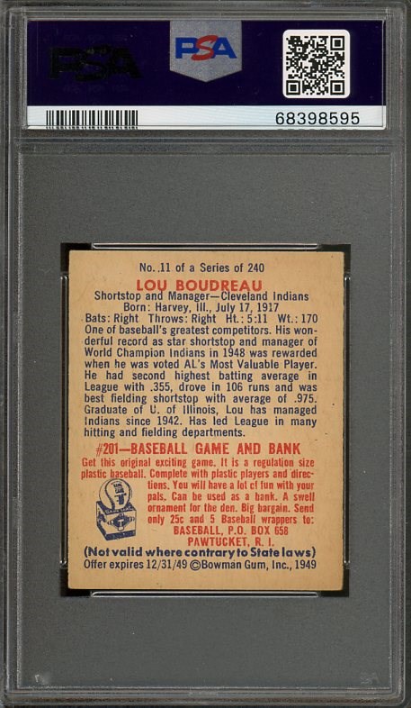 Lot # 82: 1949 Bowman Lou Boudreau RC #11 PSA VG/EX 4