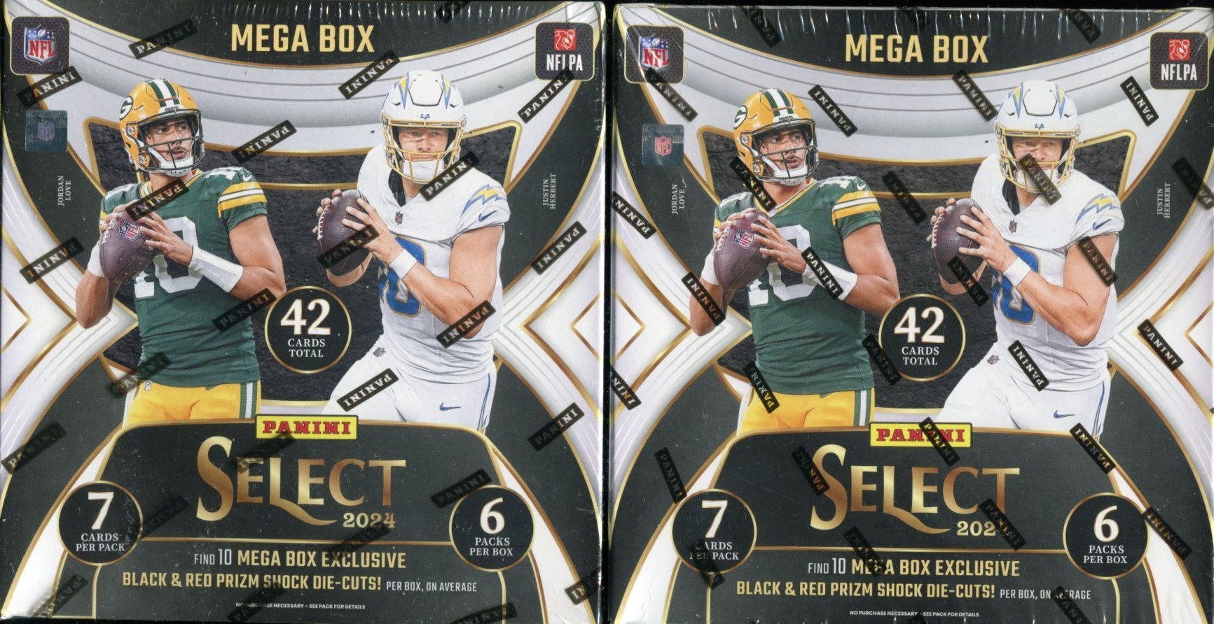 Lot of 2 2024 Panini Select Football Factory Sealed Mega Boxes - Each box contains six packs of seven cards with 10 Black and Red Prizm cards that are Mega Box exclusives.  Two box lot.