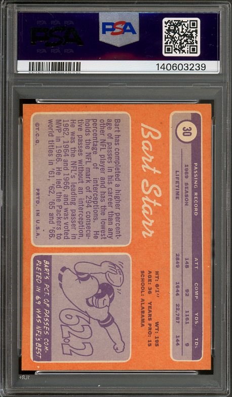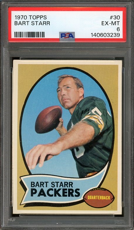 1970 Topps Bart Starr #30 PSA EX/MT 6 - A nice mid grade card of Starr. Card has nice centering, color and registration. A high end PSA 6 for your consideration.