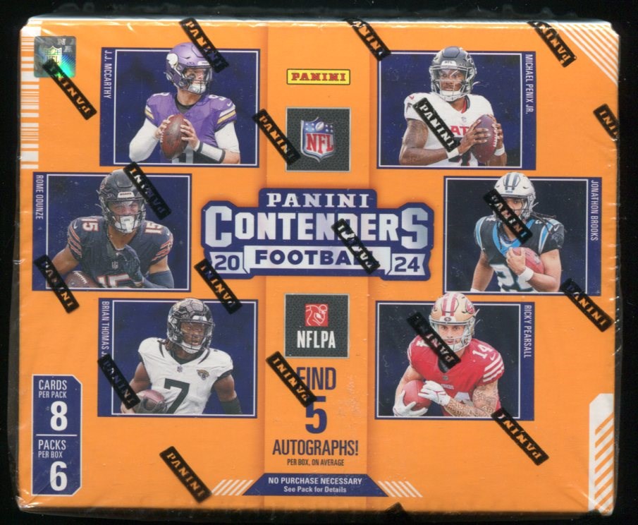 2024 Panini Contenders Football Unopened Hobby Box (5 Autos per box!) - A hot product, these hobby boxes have 6 packs per box with 8 cards per pack.  There are 5 autographs and 10 insert/parallels per box, so these are loaded!