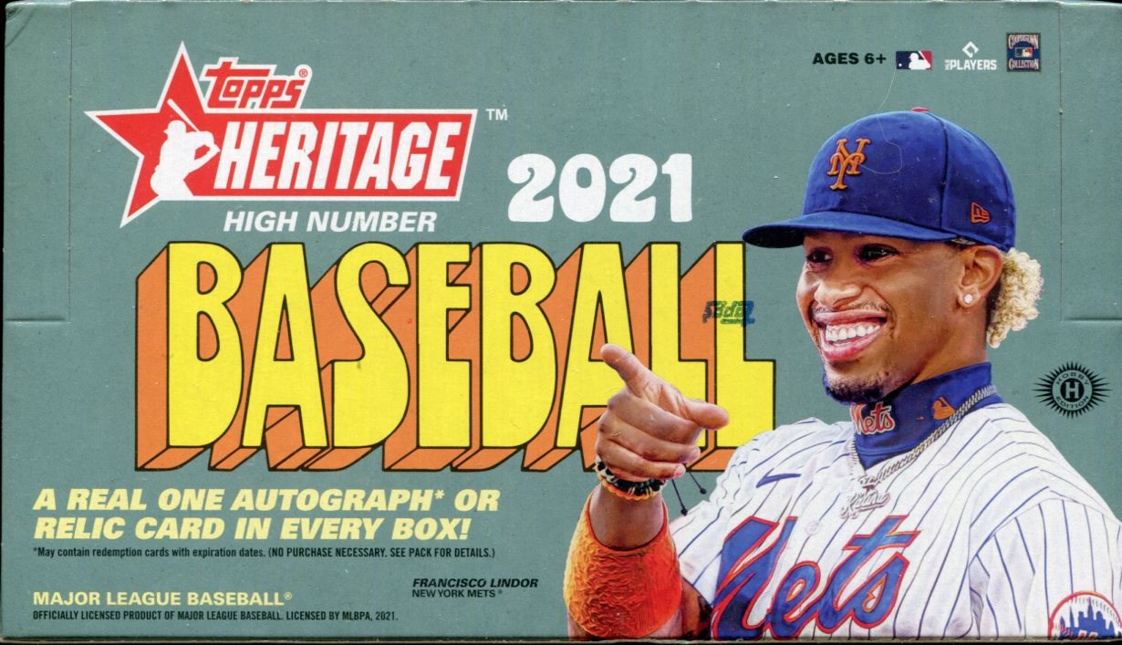2021 Topps Heritage High Number Baseball Factory Sealed Hobby Box - Features a "Real Ones" autograph or relic card per box.  Contains 24 packs with 9 cards per pack.