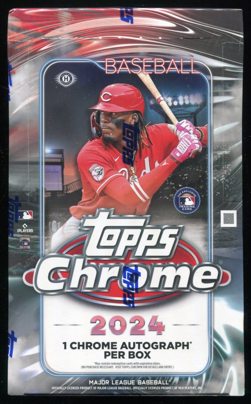 2024 Topps Chrome Baseball Unopened Hobby Box (1 Auto per box) - Super hot!  Contains 24 packs with four cards per pack.  This product has a great selection of current and former player's autographs.