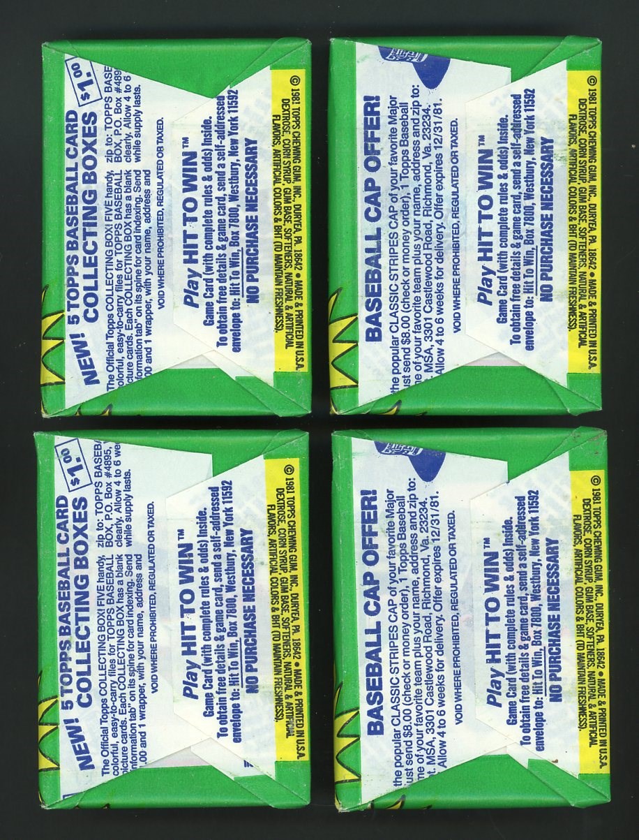 1981 Topps Baseball Lot of 4 Unopened Wax Packs - A lot of four, 15 card wax packs from 1981 Topps baseball. Packs are unopened and in EX/MT condition with light wear.